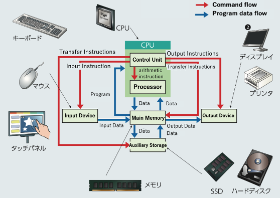 - 中央処理装置(CPU): 演算装置と制御装置から構成