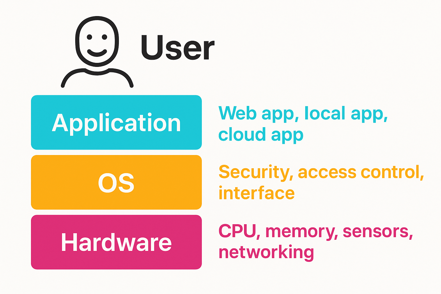 解答例:OSは従来のハードウェア制御に加え、アプリの安全性確保、ユーザープライバシーの保護、直感的なインタフェースの提供など、ユーザーとアプリケーションの仲介役として重要な機能を担っている。
