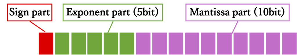 [符号部1ビット] [指数部5ビット] [仮数部10ビット]