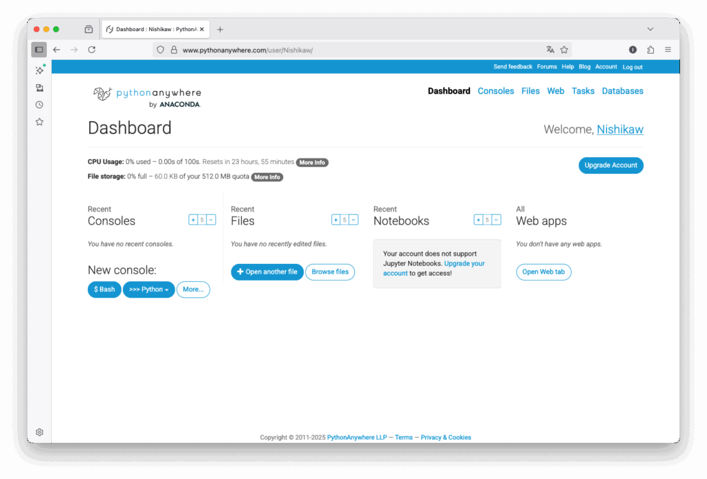 PythonAnywhere は、「インターネット上でPythonのプログラムを作ったり動かしたりできる場所」です。パソコンにPythonをインストールしなくても、ウェブブラウザだけでプログラムを書いて実行できる のが特徴です。パソコンにアプリケーションをインストールしなくても、ブラウザさえあればPythonが使える便利なツールです。