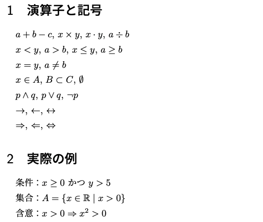 - 演算子・記号:比較演算子、集合記号、論理記号