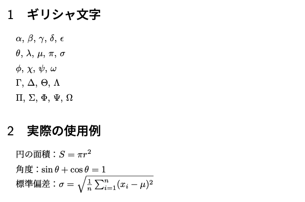 - ギリシャ文字:$\alpha$, $\beta$, $\pi$, $\theta$など